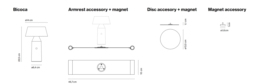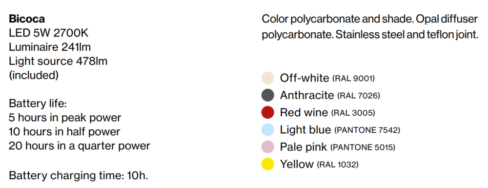 Bicoca는 폴리카보네이트로 제작되었으며, 기본적인 기하학 도형들의 형태로 구성되어있습니다. 갓을 조절하여 빛의 방향을 설정할 수 있고 세가지의 별도 액세서리는 램프의 적용성과 다양성을 높여줍니다. 강력한 자석을 고정장치 하단에 부착하여 금속표면에 고정시킬 수 있고