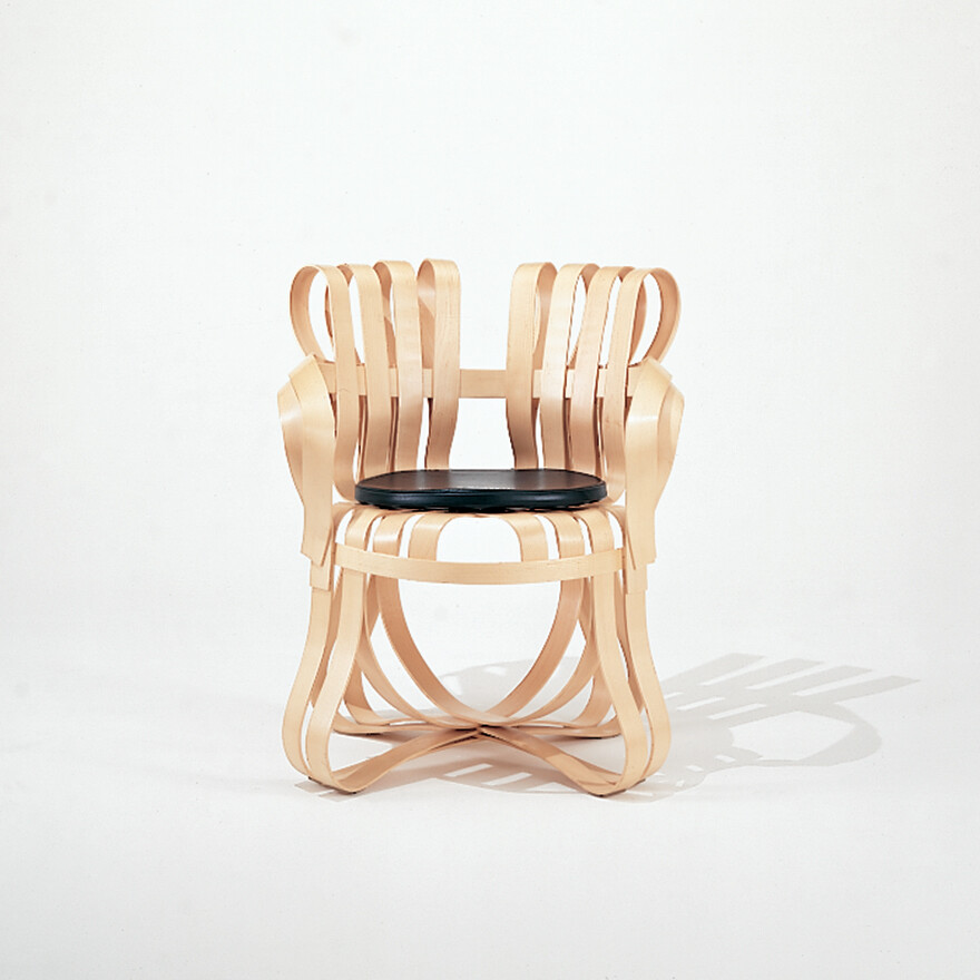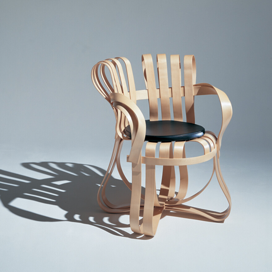 어린 시절에 가지고 놀던 사과 상자의 힘에서 영감을 얻은 Frank Gehry는 벤딩된 우드 가구 컬렉션을 선보였습니다. 리본 모양의 디자인은 기존 스타일에서 벗어나 새로운 형태를 이끌어 냈습니다.
