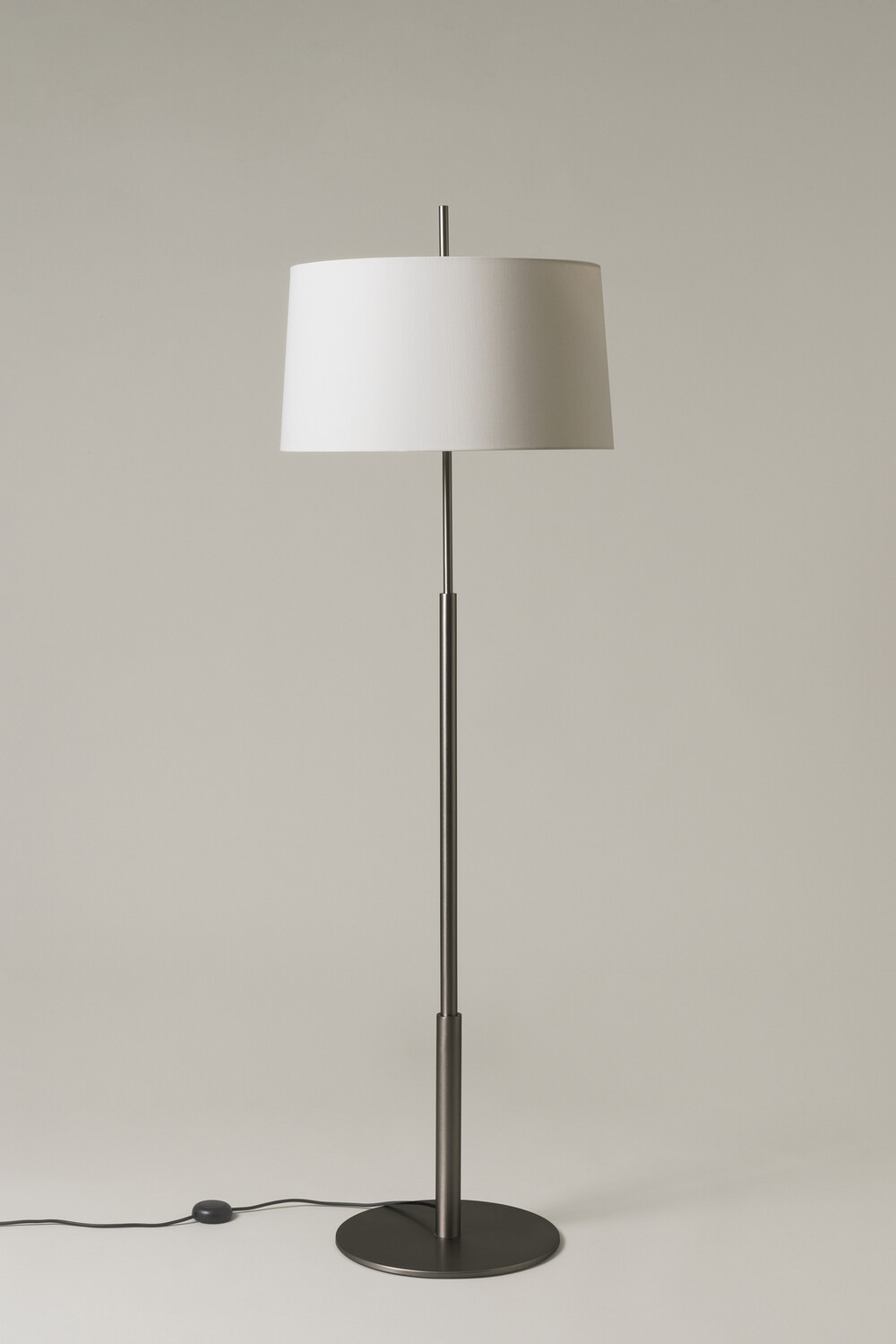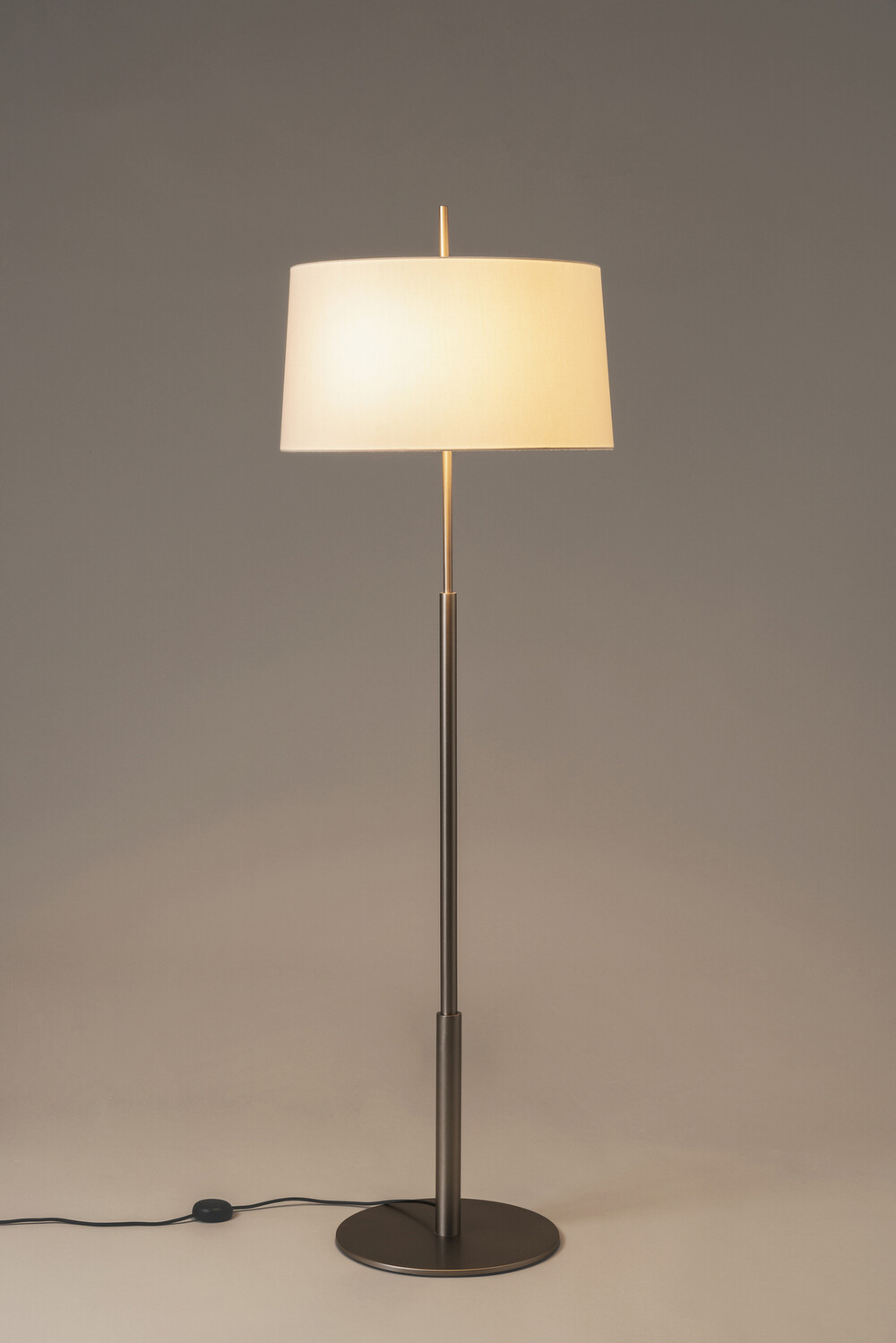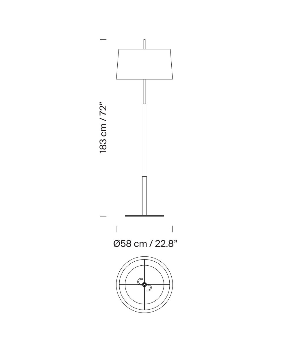 The Diana lamp is slender, sturdy and well-defined. Inspired by the table models, these floor lamps, Diana and Diana Mayor, retain the grace and definition that characterises the whole family. The lamp is balanced by a wide metal base, completed with a slightly conical white linen shade. Two bulbs are arranged such as to provide lighting without creating shadows. The Diana effortlessly combines a classic air with a modern design, both at home and at the office.