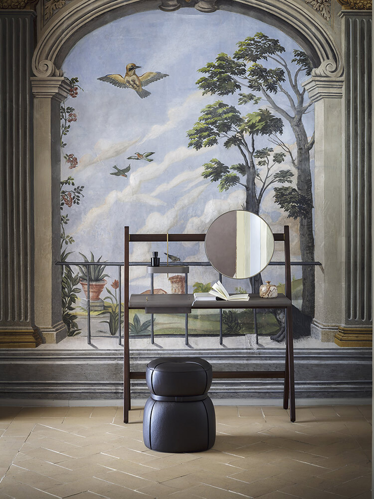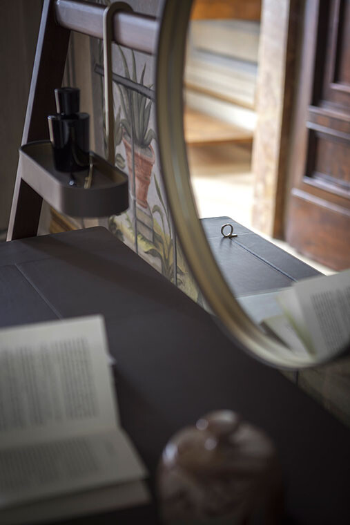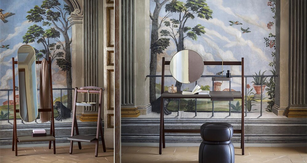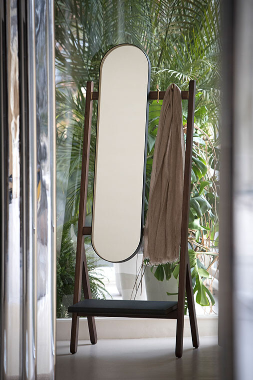 Ren은 Neri & Hu가 디자인한 가구 시리즈입니다. 생활하는 데에 있어서 편리함을 줄 수 있는 가구들을 제작했으며 시리즈 전부 두 개의 면으로 구성되어 견고한 구조를 가지고 있습니다. 그 중에서 Ren Dressing Table은 거울, 키 트레이, 선반으로 구성된 실용적인 가구입니다. 황동 손잡이, 월넛 우드, 하이퀄리티 가죽을 소재로 사용하여 고급스러움을 더했습니다.
